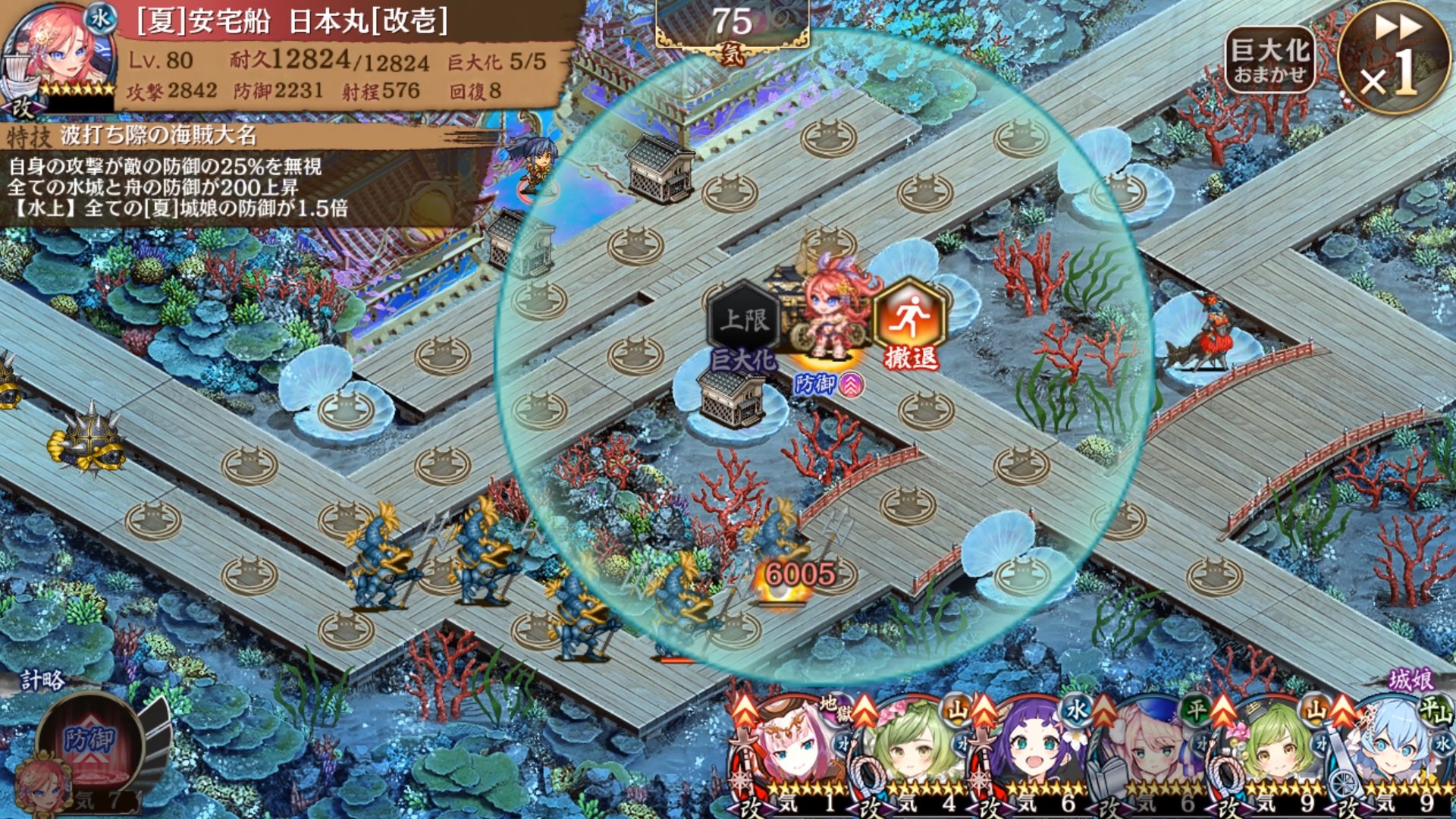 Lv80単騎でコレくらい火力出るね。計略で攻撃力+1784、防御も2000超えと時間減少するとはいえ割とイカれたバフ。ちなみにアーカートも添えると+2196(追加約400)。これに直ボ100%(=直撃火力2倍)かかるから対高防御とか攻撃一定値以下カットとかでかなり輝くと思う。船の重さで敬遠されるのもあるけど、強さが説明文からマジで分かりづらい。