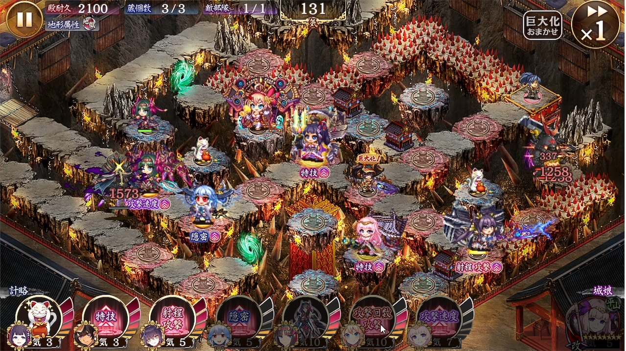 17層。元々固定武器種がいなかったので影響なし。白鳳を初手最大化して処理していく。小峯は他のユニットで龍を空蝉した後に置いて即浜松で透明化。右は鷹単騎で封鎖可能。一ノ谷や毛利などに合わせて適宜白鷺ボムや姫路計略を投入。
