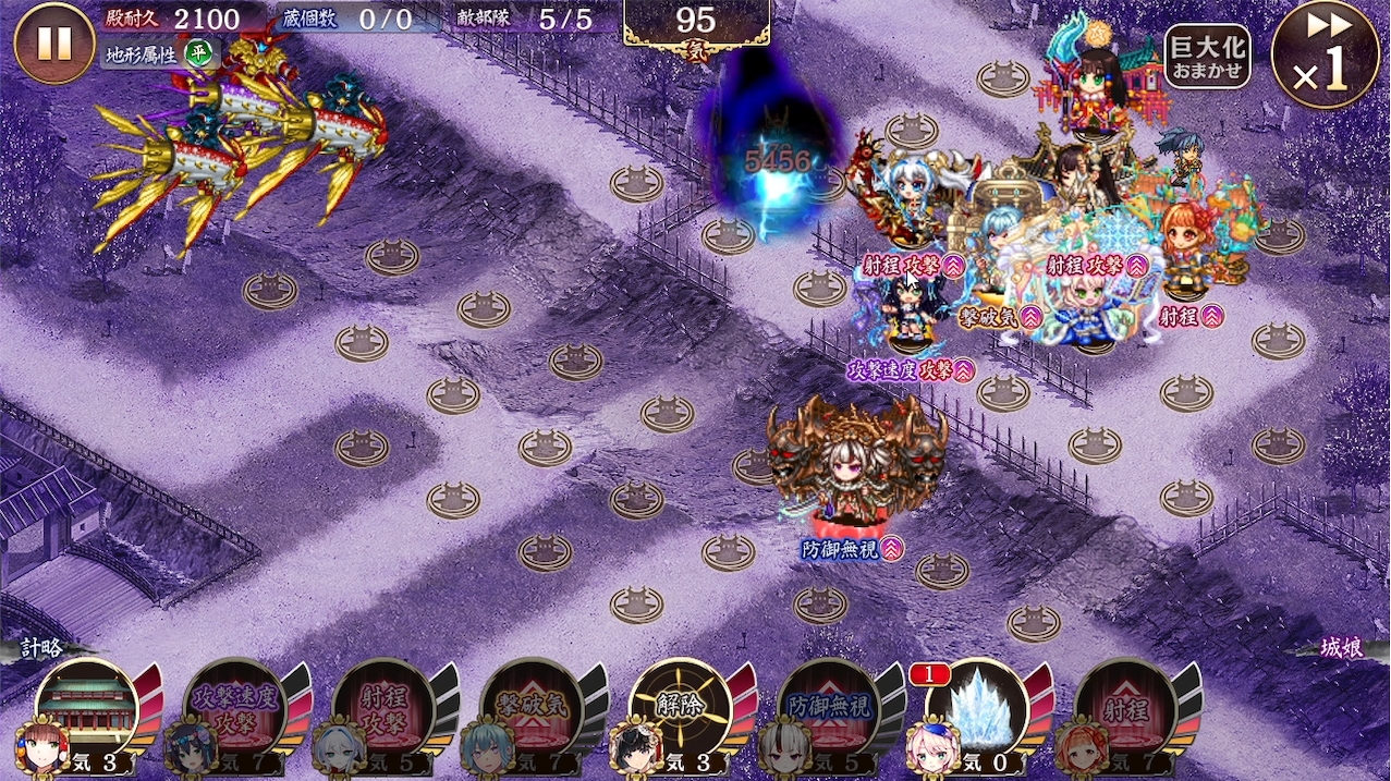 過去一でキツかった・・・。夏烏城、正月江戸の順で最大化して火力を確保したら、裏大宰府を置いて烏城の盾+天狗、金魚への火力役として大きくしておく。昌景を倒し終わったら即撤退して15に再配置、最後の金魚に備える。序盤の江戸と四代目の計略のタイミングがシビアで、ミスると騎馬に抜けられてしまう。2波の平安トークンは26に置いて大騎馬のデコイに。間に合わなかったら平安も空蝉で一度撤退。