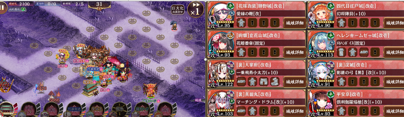 15審。この配置を基本に、四代目16→20、勝野5→16、真田8(桃形受け)→30(采配)→8(紫と天狗)→30(相撲)→8。真田丸が強敵受けと火傷で大活躍。各地に転戦してもらった。全体的に計略のタイミングがシビア。大宰のレベルは相当高くしないと厳しい。