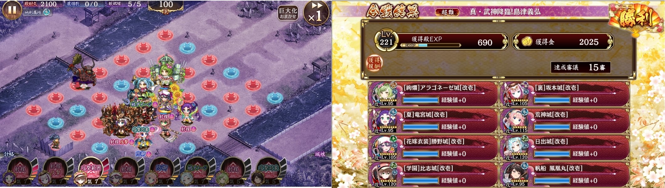 15審全戦功いけた。星6のアタッカーや足止め役は120無いときついな。島津は日出城を巨大化無しからはじめてあと1回で大破するところだった