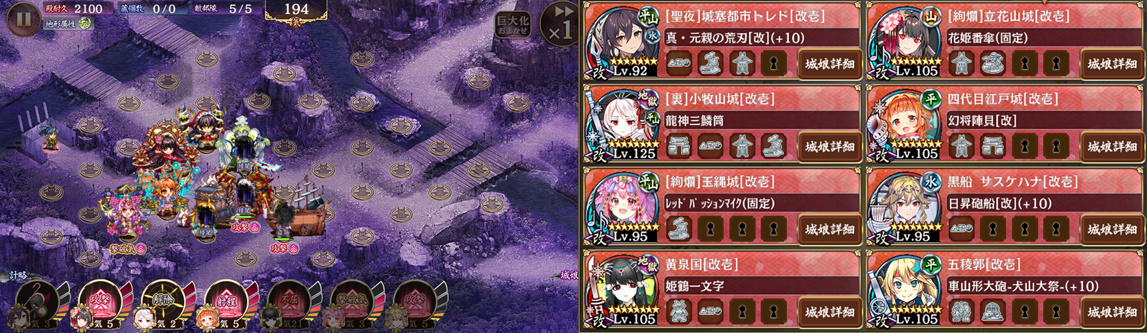 15審。計略時でもノックバックが発生する龍神三鱗筒装備の小牧山+射程内鈍足武器装備のサスケハナで攻略。五稜郭は肥前名護屋でもクリアできた。