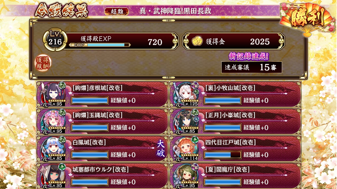 15審。9四代目、10絢爛玉縄、13夏閻魔(毒扇)、19裏小牧山(龍神三鱗筒)、14正月小峯(疾風扇)、4絢爛彦根(海鳴槍)、21白鳳、18ウルク。白鳳とウルクの配置は後で。彦根は最初の爆弾に40で空蝉してから。玉縄一回巨大化。小峯最大化。閻魔トークンを21、彦根トークンを27。彦根最大化。小牧山最大化。閻魔最大化。玉縄最大化。半月型兜が来たら閻魔トークンを25に追加。倒したら閻魔トークンを11に追加。以後基本25と11に閻魔トークン維持(爆弾と半月型が重なるなどした場合は11→36など臨機応変に)。白鳳配置最大化、ウルク配置最大化。後は適当に。