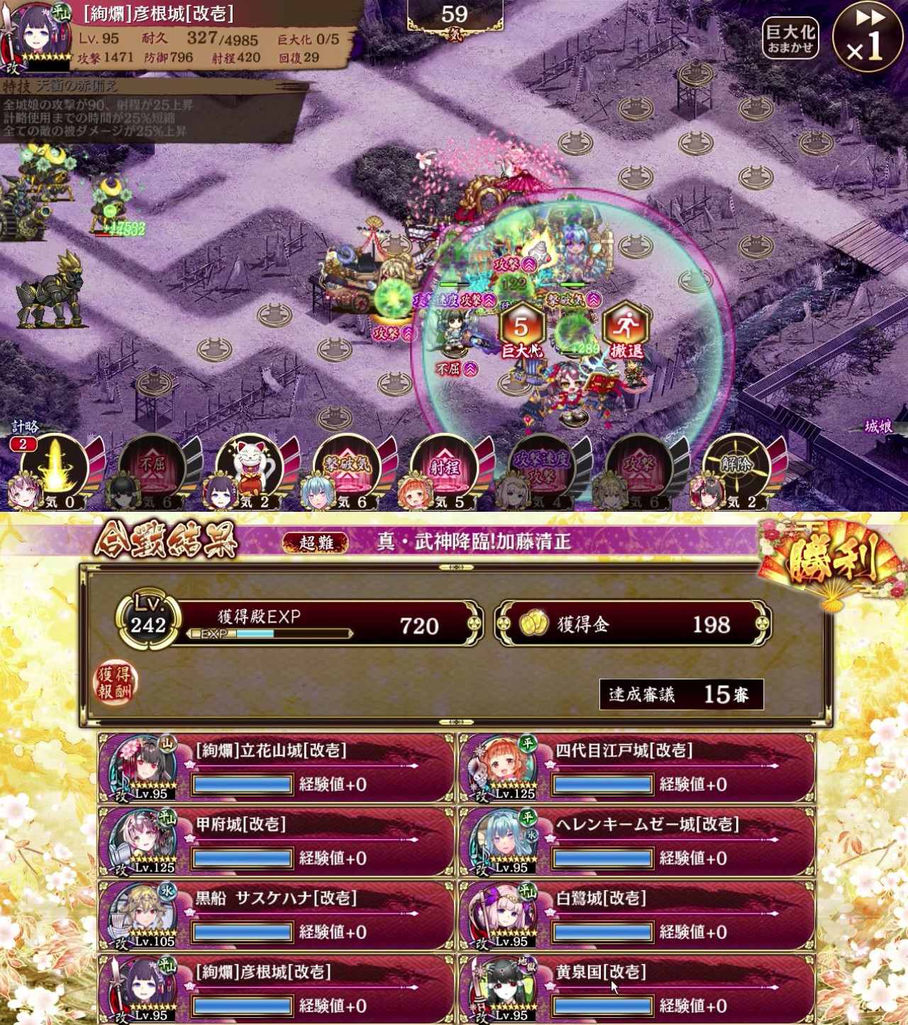 なんとか15審取れた。絢爛彦根は清正倒した後に猛毒で大破しないように巨大化