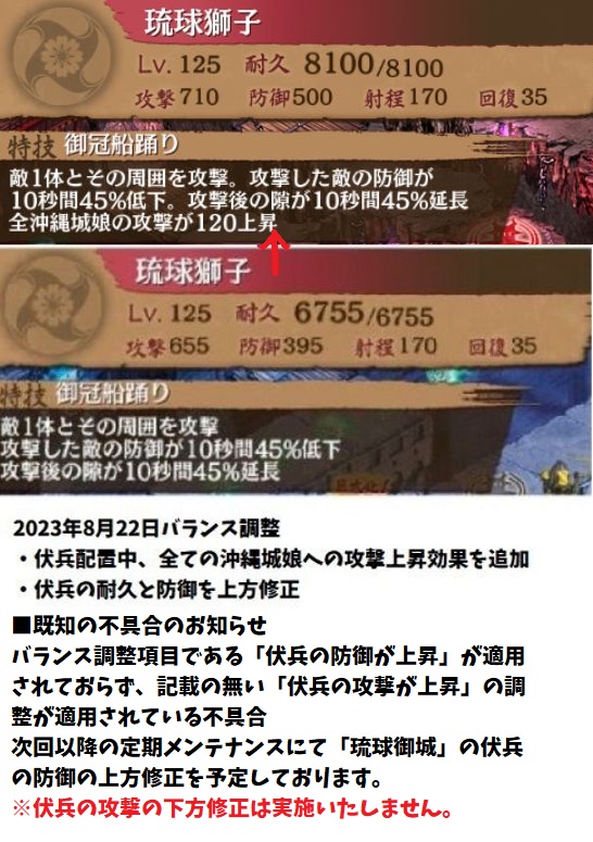 バランス調整ミスも直ってた。結局今回の伏兵の調整で上がったステータスは耐久+1345、攻撃+55、防御+105