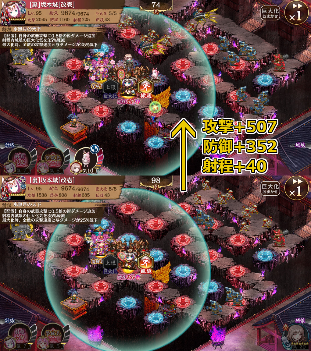 修正後のLv.80バフ量(上昇上限(+500)+1歌舞+裏坂本)。隠密で置きやすいしバフ役としては十分ね。対象が味方だったりトークン持ちだったりと他の活躍範囲もいい感じ
