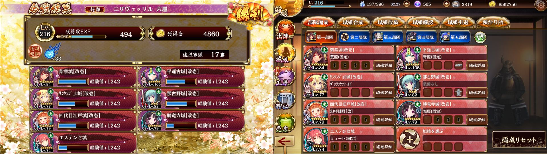 改良版。7人でいけた。四代目6→空蝉→8、紫禁10、勝竜寺4、サンタ7、平遥11、那古野空蝉→12→14、エステンセ6、気トークン16→15。最速で紫禁、勝竜寺、平遥の順に最大化すれば序盤の小法術と力士をギリギリ倒せる。ルーンは熊集団&力士に使用。ボスはサンタと那古野で空蝉足止めして殴る。