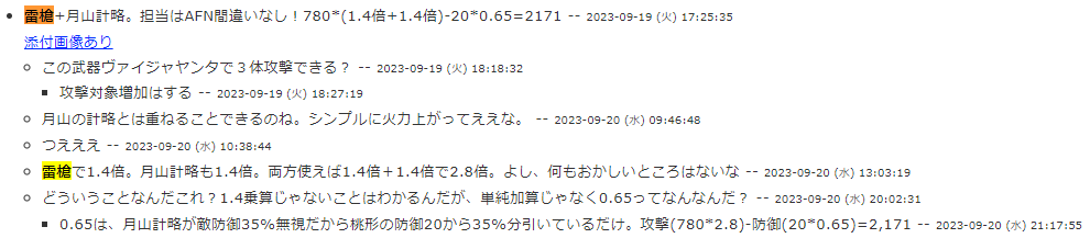 雑談板で話題にあった。1.4*1.4で1.96倍、もしくは1.4+0.4で1.8倍になりそうな所をなぜか2.8倍になってるらしい。