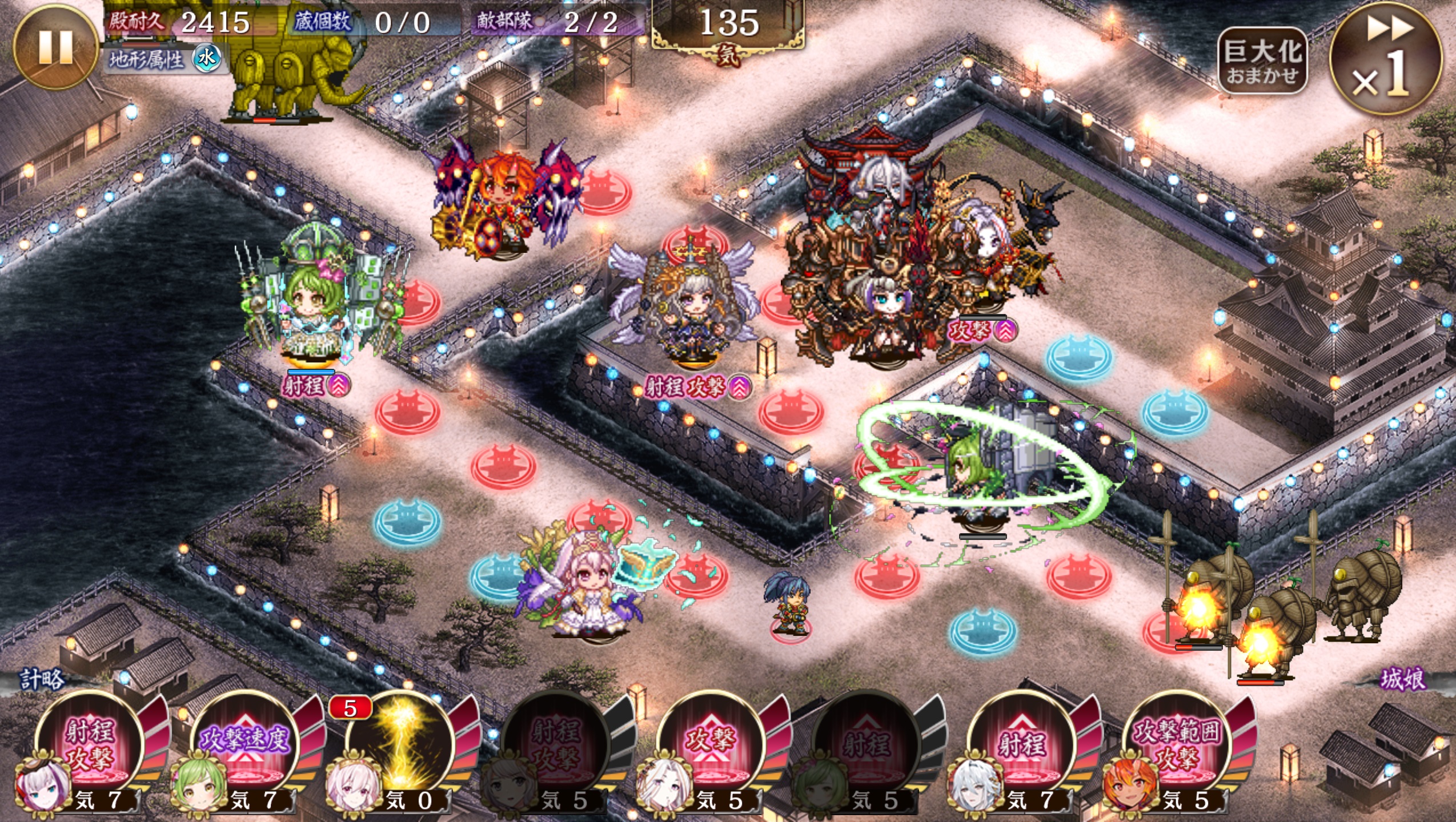 レア度の暴力。裏坂本は左上→右下→中央。左の大砲受け要因に手持ちで一番硬い鬼ヶ島入れたけど、裏桜尾の計略中なら絢爛アラゴでふつーに耐えれる(そもそも1が先にタゲられる)から全く意味無かったっていう。ただ上から来る鬼人形の攻撃力がかなりきついので、デコイ役はほしいかなー