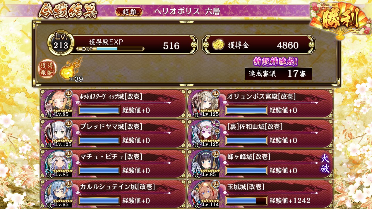 17審。メンバー選びに結構苦戦したけど、このメンツならかなり楽勝と思う。ホッホは1段階目の初計略でも十分受けきれるので、HP減って来たら巨大化を繰り返す。無凸ホッホでも最後まで受けきれた。削り切れる火力無い場合はラストにプレヤマ挟んで終了。