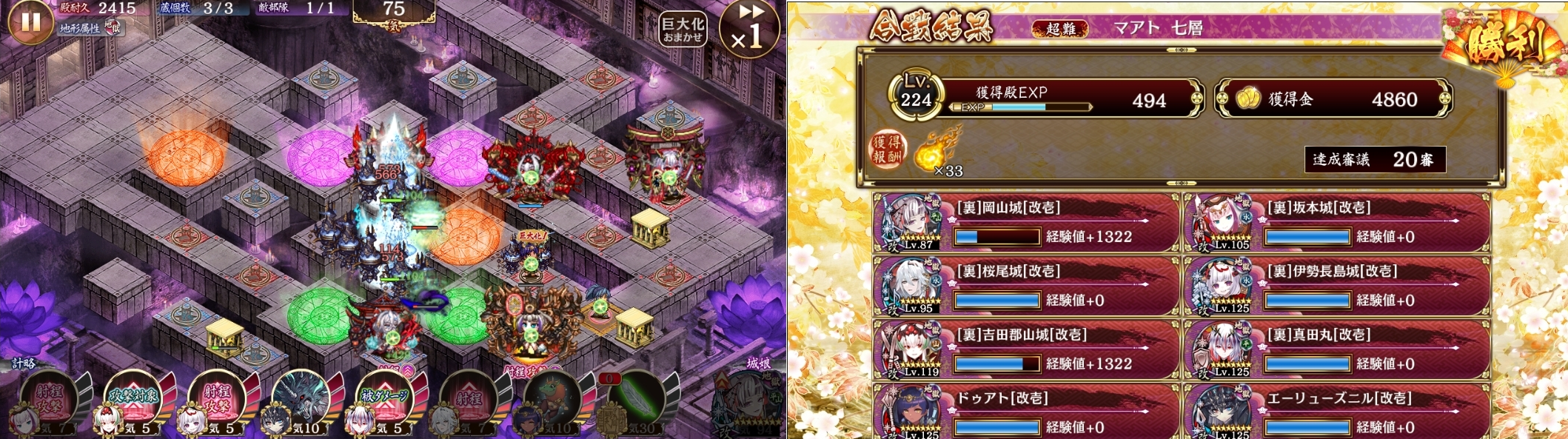 20審ガチャ3人配布5人。ラー以外の四天王と右と中央の影は全部裏吉田郡山におまかせ!裏真田の耐久バフが無いとお尻の攻撃に裏伊勢長島が耐えきれない。ラーはアミメ→犬→裏岡山→アミメで空蝉後ワープ(置き順で裏伊勢長島受け)で終了