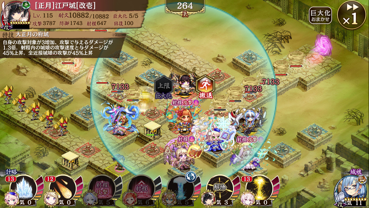 正月江戸は1.3倍に2倍まで乗って2.6倍プッシュのインチキなんだけど、中途半端なバフだとオンボス4のは倒しきれず蔵壊される。砂嵐のHP15kぐらいあるし鈍足効かないから他の刀じゃ無理だろね。つーかこの場所パチンコに狙われてウザイ。オンボス6もだけど本来の目的果たせなくなってぶっちゃけ微妙。