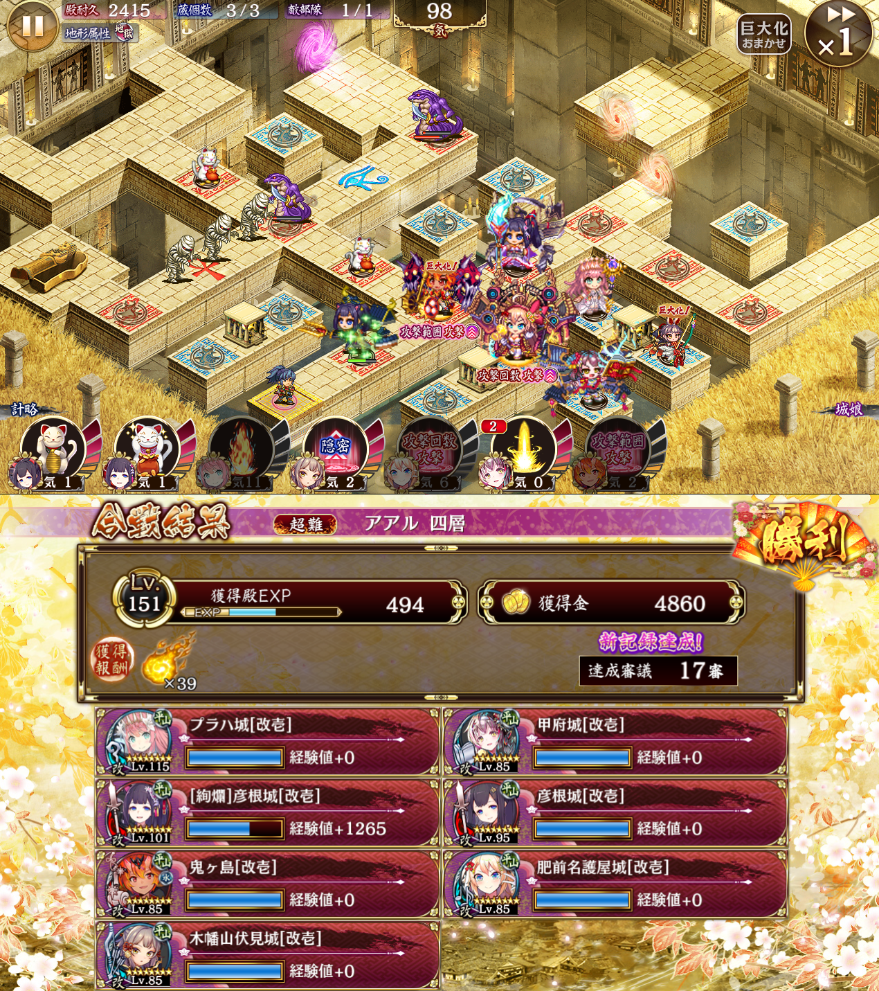 プラハ甲府砲のWダメ計で17審。とにかく二人にバフ盛ってぶっぱしてたらいけた。狐は最後の二体が出てきた時になーむなむするとちょうどいい感じにフルヒットする。