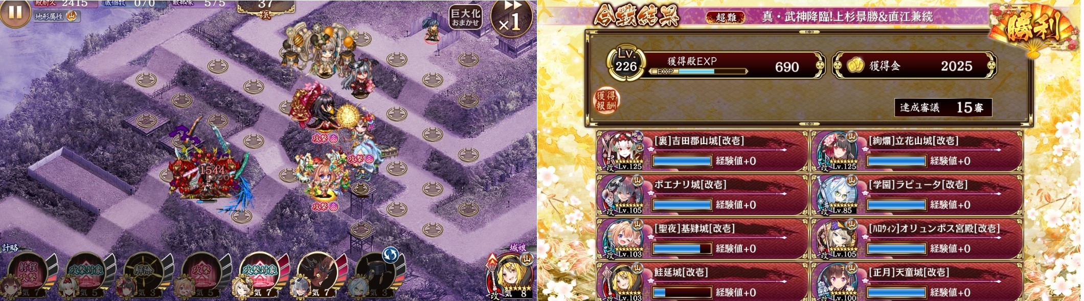 上のを参考にして15審全戦功いけた。最後の方の鳥と眼鏡ラッシュが終わって騎馬が現れた辺りで正月天童で兼続起動し倒す。倒したら14鮭延を撤退で景勝が動いたら13裏吉田郡山で起動即撤退。後は鮭延と裏吉田郡山で空蝉リレー(ハロオリュンポスの特技で完全に止められる)して終わり。吸収足止め付いてる干将莫邪は何だかんだ便利ね