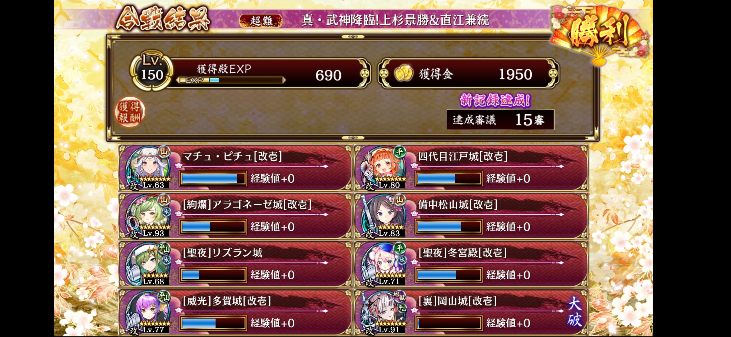 威光多賀城のおかげでレベル低めの編成でも15審クリアできた。高防御の直江の対策として絢爛アラゴと裏岡山は防御無視割合の高い武器を装備した。聖夜リズラン城のトークンは火力役じゃなくてデコイとして使った。