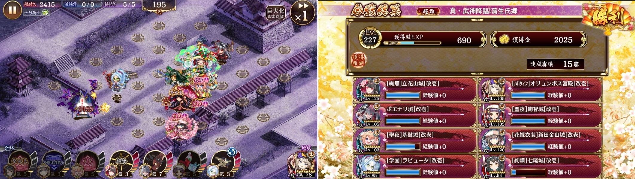 15審山縛り。初期武神だから簡単かなって思ったら氏郷以外は楽だけど氏郷だけ1回は嫁ニッカナの射程外から確実に攻撃される&伏兵隠密化&再配置時間延長で非常にキツかった。
