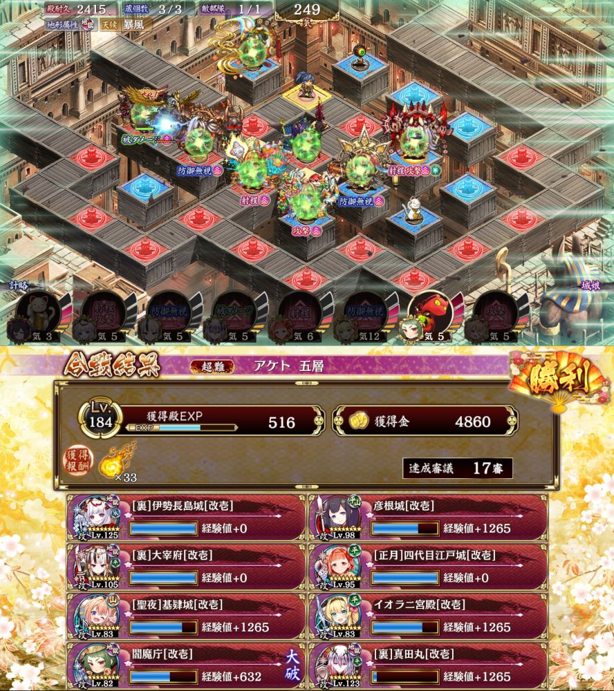 裏長谷堂縛るとホルスが超堅い。けど攻撃はノロいのでトークン持ち連れてけばあとは殿到着までに削れるかのDPS勝負。邪術佐竹は裏真田丸で焼いて、回復するやつは回復反転で対処。転戦は裏真田丸34→4、裏伊勢長島26→25(射程減でホルスがトークン殴れなくならないように)
