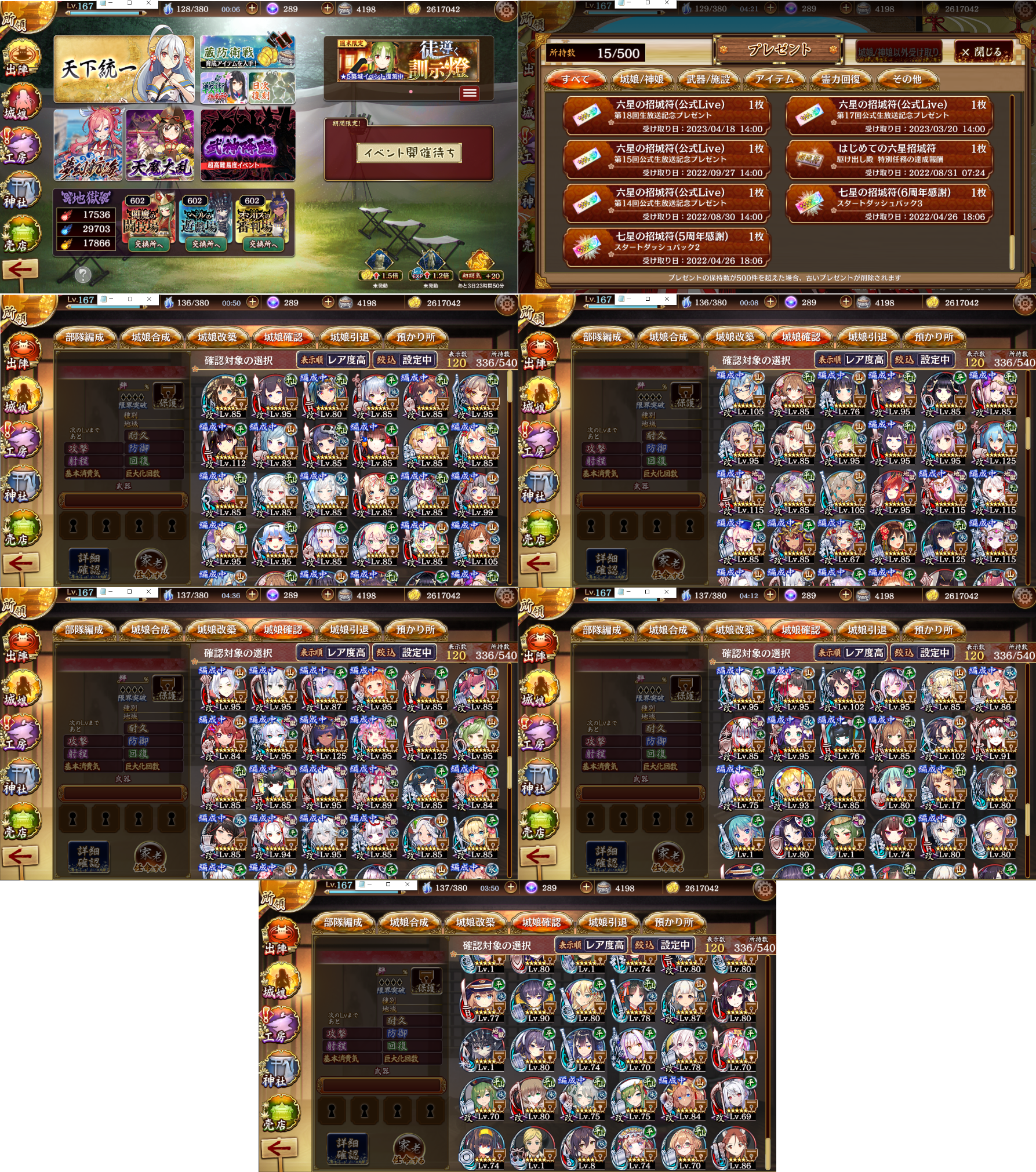 無課金2年弱(正確にはリリースから2ヶ月やってそれまで休止)で602審できたので所持晒し。☆6以下は使用したキャラのみ。龍神像はオンボス5とアアル6で使用