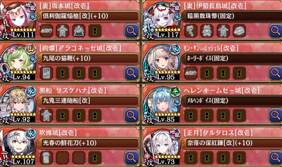 つべに上がっている動画を参考にしつつプレ山を正タルに替えて、絢爛アラゴの装備を九尾鞭にした感じでした。最初に裏坂本、モンサン、ヘレン、サスケハナ、絢爛アラゴを配置して。裏坂、ヘレン1回巨大化、アラゴMax巨大化。吹揚配置、モンサン・サスケ計略。モンサン・ヘレン数回巨大化しつつ、吹揚計略配置後に撤退。隙を見て裏長島配置。鯨動き出す前に気を40程度貯めて、2に正タル配置最大化撤退。サスケハナは最初の南蛮傘出てくるまで巨大化せずに撤退。8に吹揚配置しつつ、正タルを敵にボム…って感じでやりました。光秀来る時には計略一斉発動で、何とかサスケハナが攻撃耐えてくれるので攻略です。
