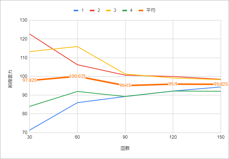 おみくじで霊力がどれくらい回復するかの記録をまとめてみた。一番左が1で一番右が4。それぞれの場所で150回ずつです。平均するとだいたい96に収束しているから、おみくじを引く場所で違いはなさそうという結果でした。