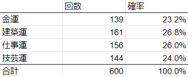 おまけ2。運勢タイプ(?)の発生回数です。金運がちょっと低いですが、これも続けていけば25%に収束すると思います。均等に設定されてるっぽいですね。