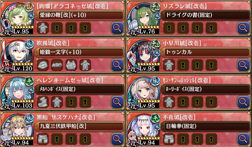 こんなんでも行けた。水上のサスケの火力半端ないな。吹揚で殿の後ろを止めて、12不夜城でボス受け
