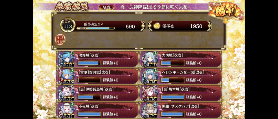 水染めでクリア。陣貝は小早川の代わりに大溝城を採用。鳥海城の計略が古河城とマッチして良い感じでした。後ろから突撃してくる鬼武士には不夜城で殴り合ってもらった。