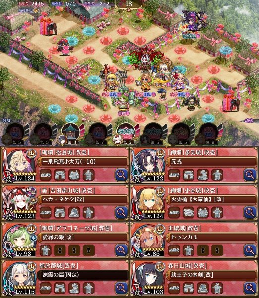 左からの状態異常は絢爛小谷、右上からの状態異常は絢爛多気で受けておしまい。なお配布だからええやろ精神の高レベルパ。受けキャラ決めるの大事