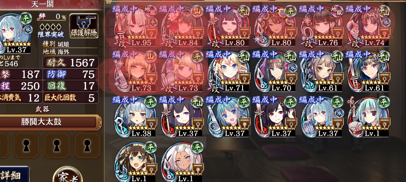 上で周年チケ4枚交換で質問した者です。地獄一層を審議10で進めてる所です。すぐスタミナ切れるのでイベント絶壱の周回が追いつかず、☆5餌が貯まりません。改築は貰ったメガネでやってるのであと一人しか改築出来ません。写メの色付きがスタメンですが☆7全部載せてます。改築オススメとスタメンのバランスでアドバイスお願いします。入れ替えも名護屋と小峯位で他は使ってなく天下統一は五章に入りました。