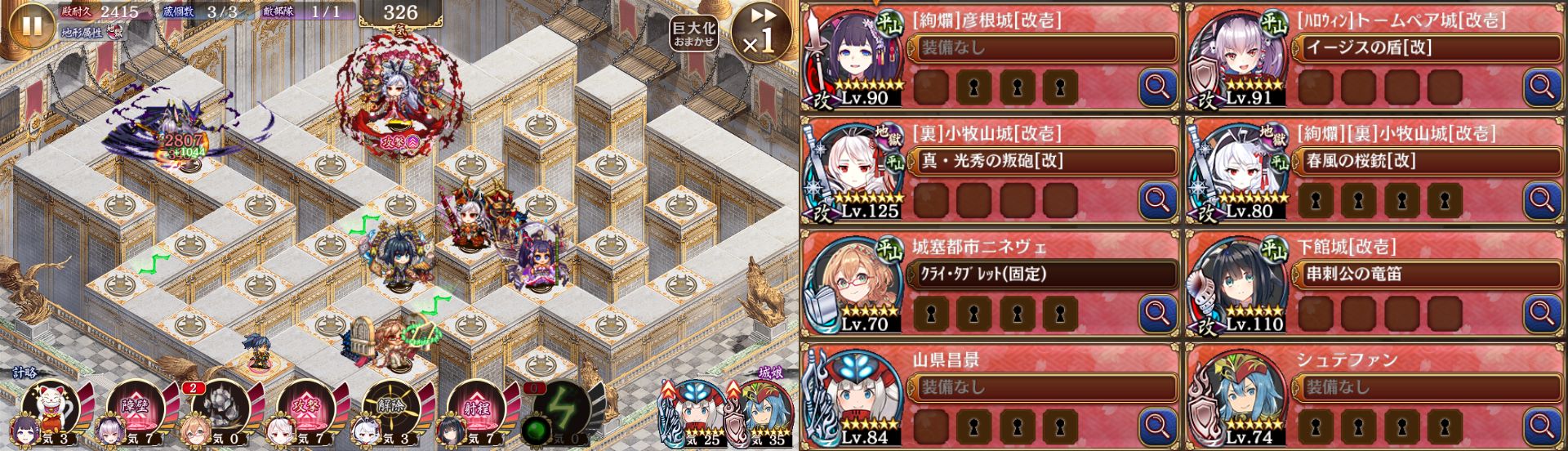 17審。山県とシュテファンは編成特技用。絢爛裏小牧は最初21、2匹目のバリスタが片付いたらすぐ11に移動。トームペアは最初6、2匹目の忍者が片付いたら3に移動して盾を足止め。無印彦根でも試したけど気稼ぎと特技の兼ね合いで厳しかった