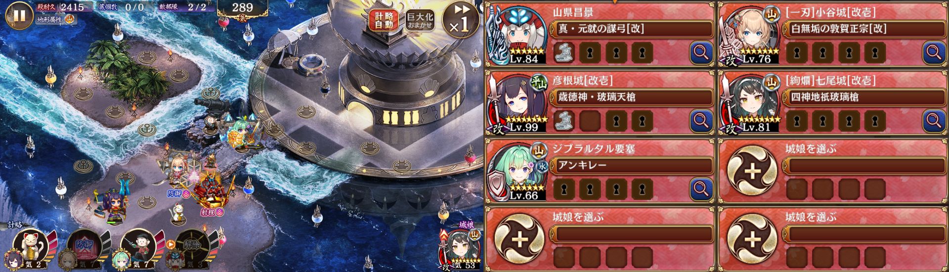 ガチャなし5人編成。最初は6彦根、18山県、13異伝小谷、20絢爛七尾を配置し、猫を置きつつ絢爛七尾を最大化。異伝小谷が接敵したら自己計略使用。次に山県を巨大化後、計略使用。同時に七尾計略も使用して気を貯め、彦根を最大化。全自動計略をセットし、異伝小谷も最大化。上から鯨が来たら絢爛七尾を撤退させ、鯨上陸後に同じ場所にジブラルタルを配置。17にジブラルタルトークンを配置して、あとは異伝小谷が大破しないよう適当に計略と特殊能力を使って終了。