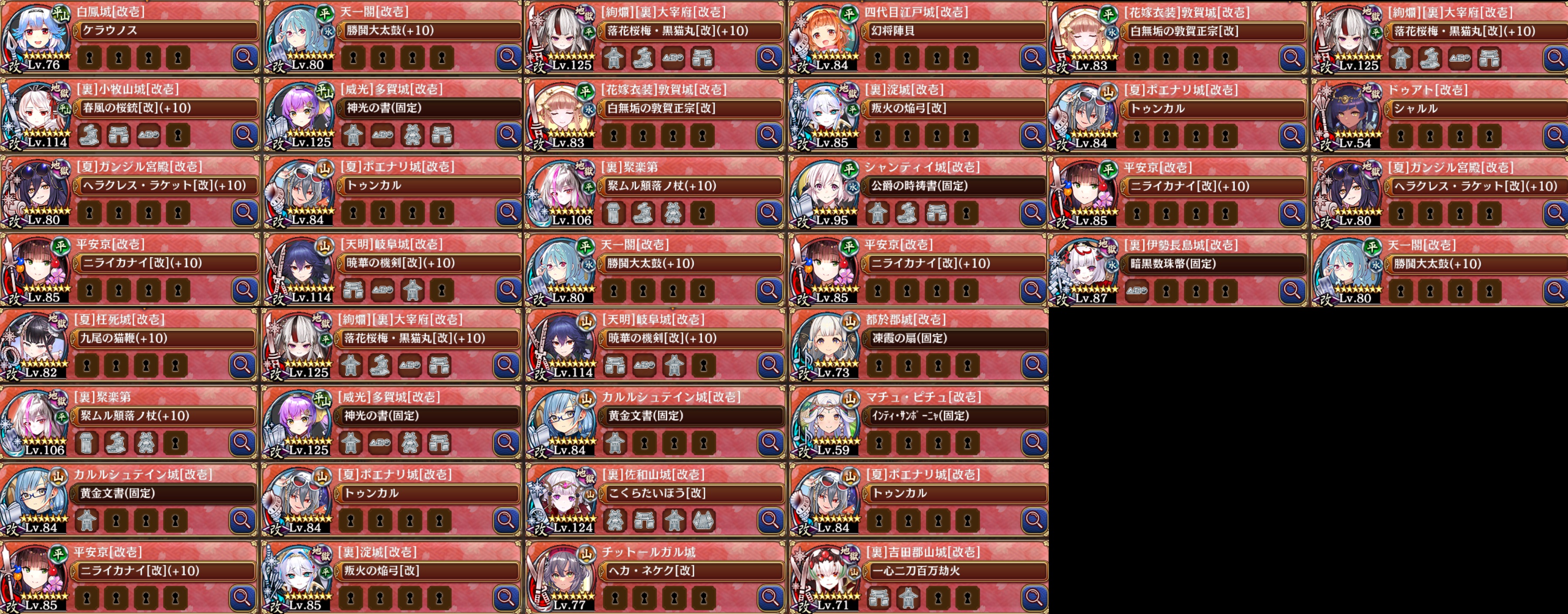 左上からZ字の順に針山-賽の河原で、気関連と地形抜きが多い。強い子の出やすい新ガチャに絞って回せてるってのはありますね。復刻討伐のおかげで大量の珠補充されたし。
