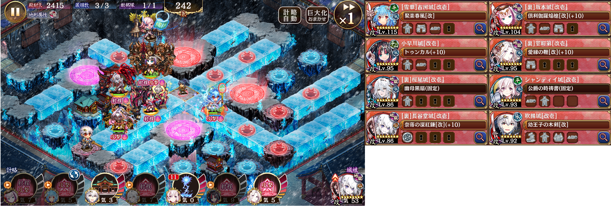 上に合ったコメントを参考に坂本22→13→12、小早川19→13で配置換えしながら古河と裏室町を最大化。気はそこそこ余裕があるので適宜途中から計略オートしっ放し