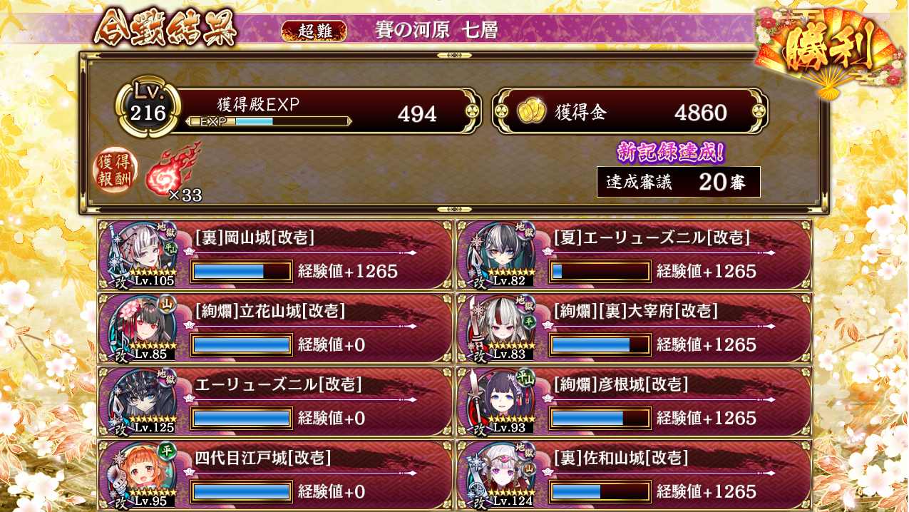 20審議クリア。夏ポエナリと威光多賀がいないので他を総動員。ここをプレイするまで絢爛立花山が巨大化しないと気を生産しないって知らなかった・・・