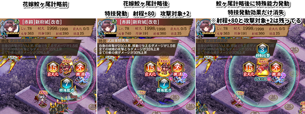 花嫁鮫ヶ尾(特技発動、射程+80、攻撃対象+2)持ってる事に気づいて調査。空飛ぶと計略の特技発動効果だけ消失して、残りの射程+80と攻撃対象+2効果は残り続けてました。机上の空論で序盤に浜松系計略投げるのは費用対効果としては悪くない選択肢だと考えてたけど、特殊能力使用時と特殊能力が切れる時に効果が消えるのはシンプルにアホ。