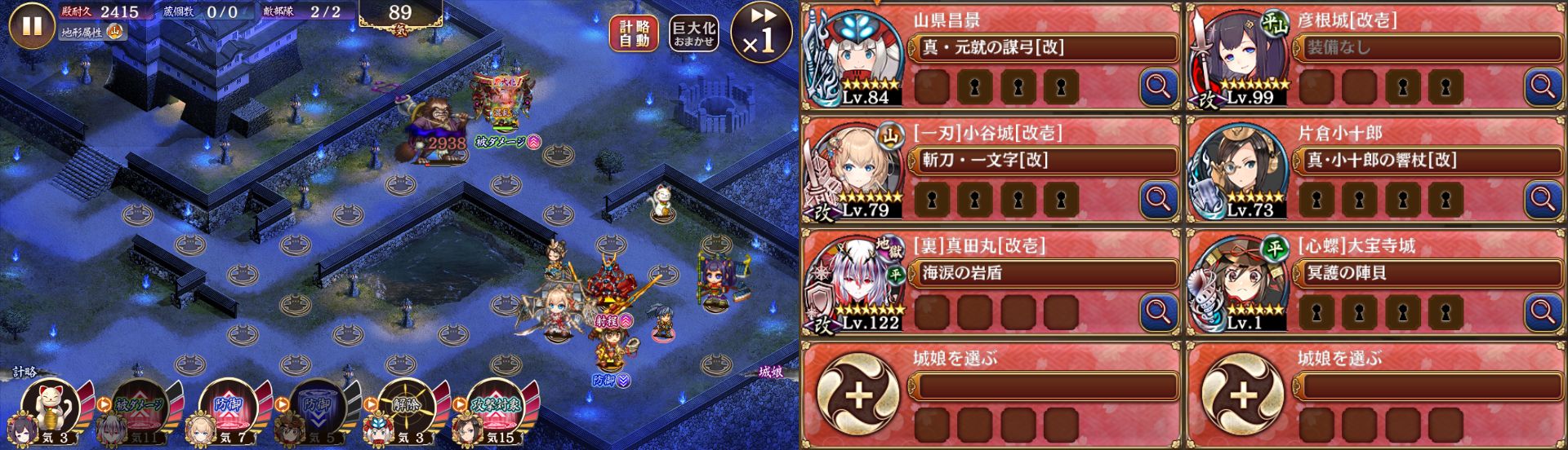 ガチャなし6人。43彦根を配置、即最大化後、36山県、31直江、37異伝大宝寺を配置して全計略自動セット。兜娘を順に最大化したら40に裏真田丸を配置し、鬼武者を足止めして撃退。2Wに入ったら裏真田丸を24に転戦、32異伝小谷配置。異伝小谷を最大化して、ラッシュに入ったら異伝2人の特殊能力と異伝小谷計略を発動。気トークンは39と42に置いて、竜に壊されたらすぐに置き換える。