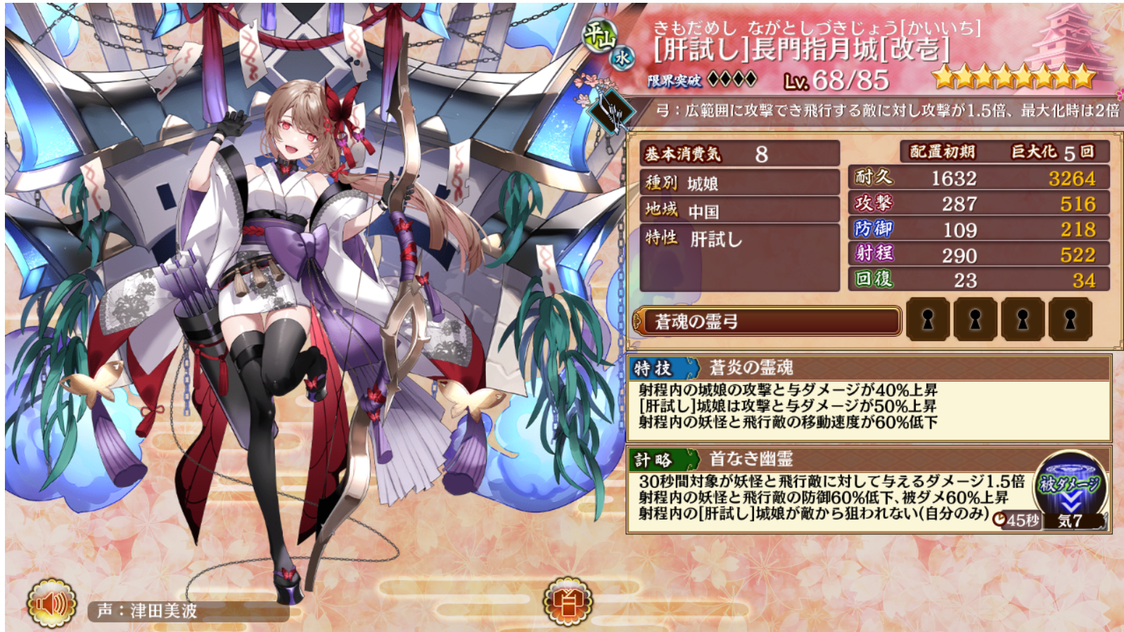 えーっと、「射程内の城娘の攻撃と与ダメージ40%上昇」で、次の欄「{肝試し}城娘は攻撃と与ダメージ50%上昇」って言うのは(射程内の){肝試し}城娘はってことかいな?それとも射程内外は関係なしで肝試し城娘は数値が上がるのかな?
