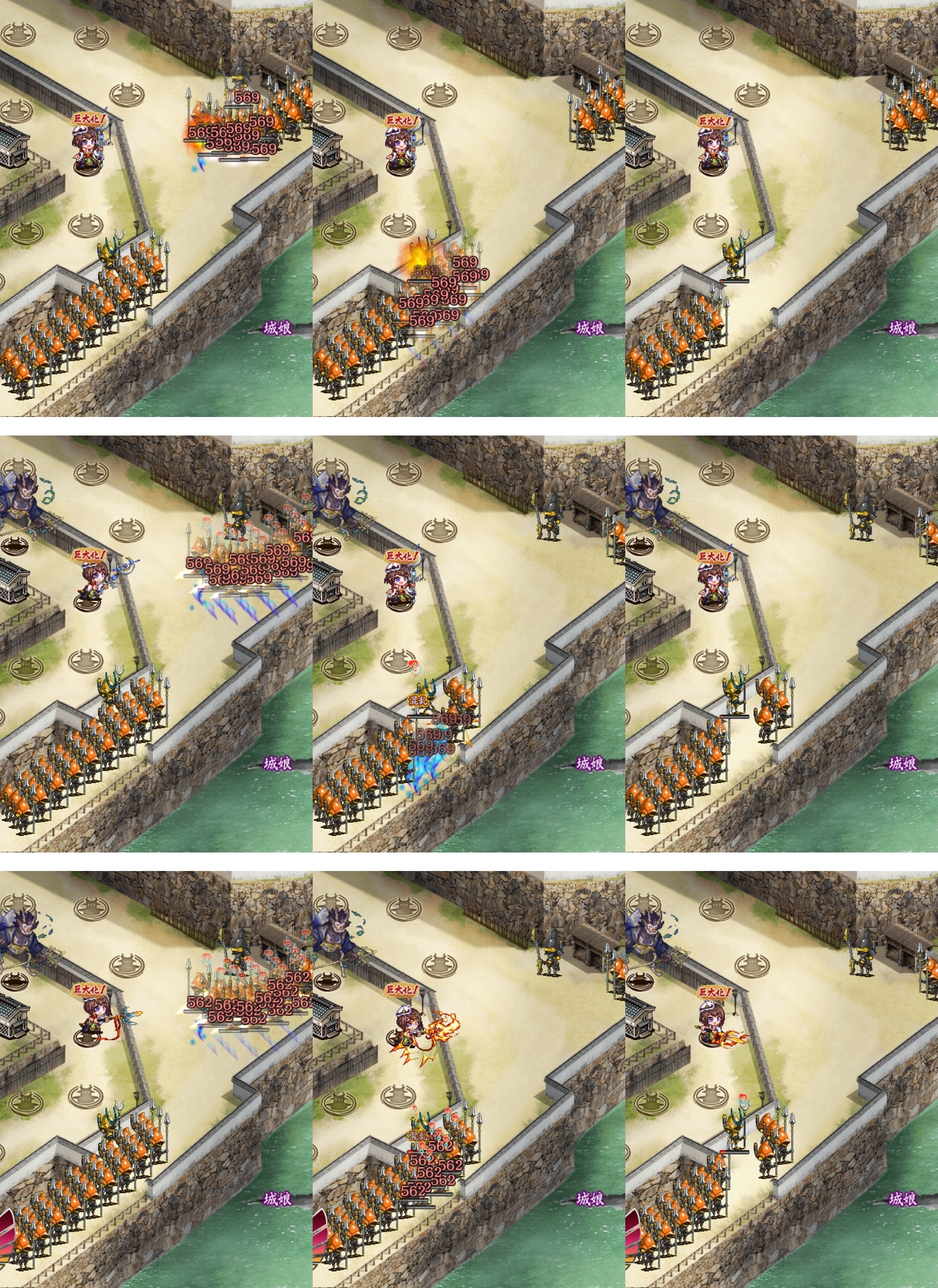 冥界の儀仗に伏兵配置中の貫通距離1.5倍が入ると、攻撃範囲は普通の物理武器を持たせた時の範囲×1.5倍に変わる。見た目も球を飛ばして爆風が発生するエフェクトから、球も爆風もない普通の槍と同じものに変わる。術効果や攻撃速度は変わらない。画像は、上:冥界の儀仗、中:冥界の儀仗+伏兵、下:同射程の物理武器(画像は幸村槍)+伏兵