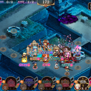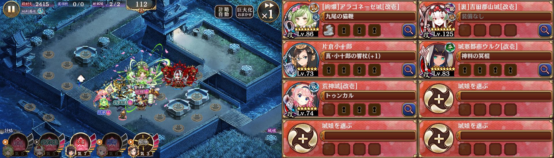 5人編成。最初は速やかに20絢爛アラゴ、21荒神を配置しアラゴ計略自動化。アラゴを4回巨大化し、計略発動したらすぐ荒神を15に転戦。アラゴ最大化、18片倉配置、21ウルク配置と進め、片倉を巨大化したら片倉と荒神の計略自動化。南蛮笠はウルクの不屈で受け、落ち着いたら26裏吉田を配置して特殊攻撃で日輪破壊。後は適当に特殊攻撃とか不屈とか使って終了。