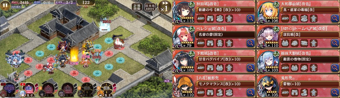 左上から来る大型大砲が結構痛いので隠密持ち込んで遠隔守りつつ盾受け。右下の大型大砲は攻撃開始位置に着く前に大和郡山がばっちり倒してくれて楽できた