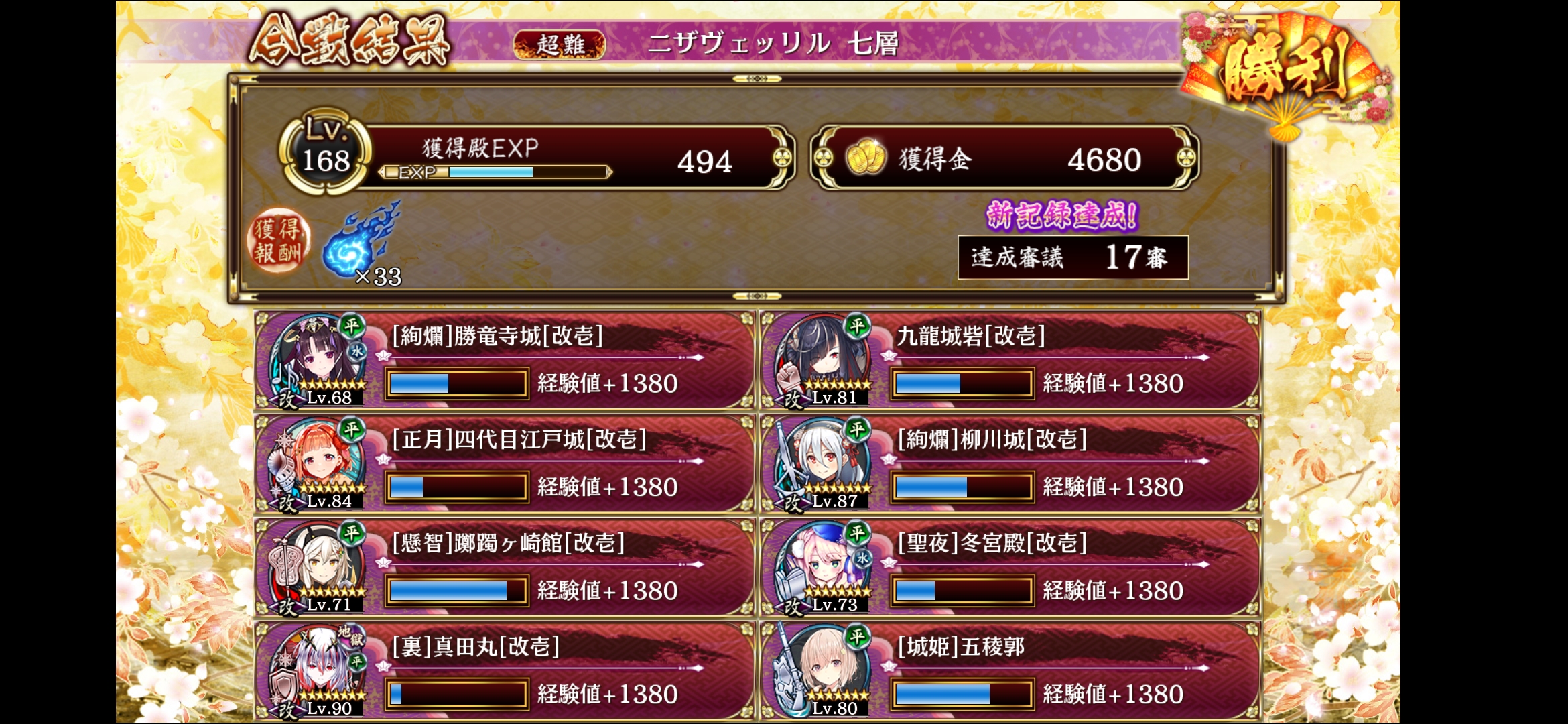 審議の性能強化を外したら17審はクリアできた。[懸智]躑躅ヶ崎館と九龍城砦がいると攻略しやすそう。序盤は16に九龍城砦を置いて巨大化すると楽かも。