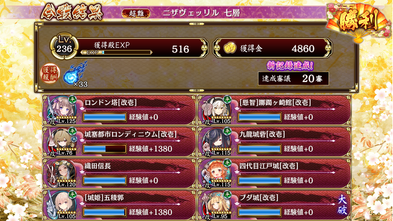 敵の9割くらいは九龍城砦が倒した。五稜郭が気を抑えながらバフってくれて強かった。躑躅ヶ崎はいないとクリアできる気がしなかった。
