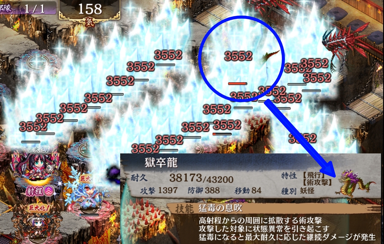 普通の兜の中に一体混じった妖怪に対して、古河の術ダメージが半減されてない様子がこちら