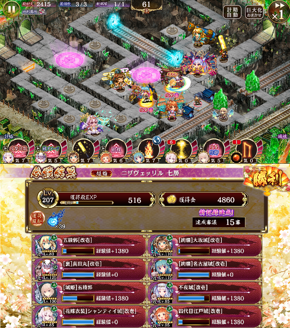 性能強化、性能増強抜き15審。不夜城は最初11、福島倒してからサヴォ倒すために20に移した。絢爛名古屋は初計短縮29%で近接3人に計略して気稼ぎ。その後はダメ計で右から来る厄介な敵とトロッコを同時に焼く。タイミング合わないので石壁の時のトロッコは見逃す。絢爛大阪のトークンでの囮も重要。福島は裏真田丸に大阪トークン添えればノーダメなので気長に倒す。