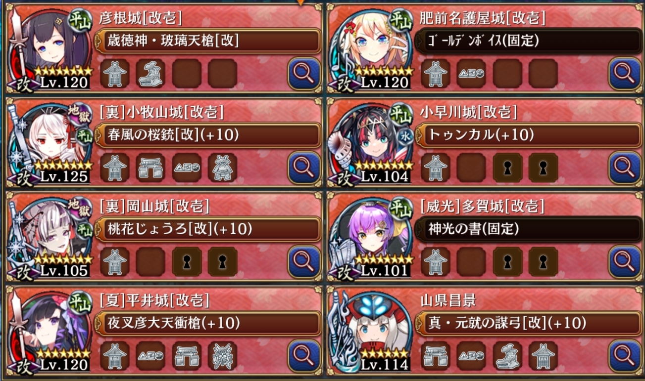 装備施設はなるべく控えめで以下の画像。まず全員に配置気。裏小牧→入手性を考えて春風の桜銃を持たせてるけど絢爛裏小牧や肝姫路の銃などでもたぶんok。肥前名護屋→序盤に巨大化1回でバフを届かせるため射程施設。裏岡山→範囲攻撃+鈍足のじょうろ。夏平井→武器はCT短縮、施設は攻撃4000超えるように調節。彦根→適当。
