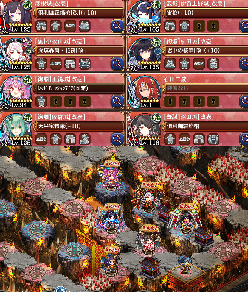 20審。まずは伊賀上野最大化、小牧山配置。右蔵は引田のトークン。伊賀上野の計略は基本氷で毛利には火。右に待機してる猿を起動しないように、雑魚2匹が動き出してから計略発動。玉縄は竜倒してマスが安全になってから配置。沼田は毛利に計略するだけ。左にトークンやらで毛利の囮。佐倉も囮以外に使わなかったので本とかに交代可。