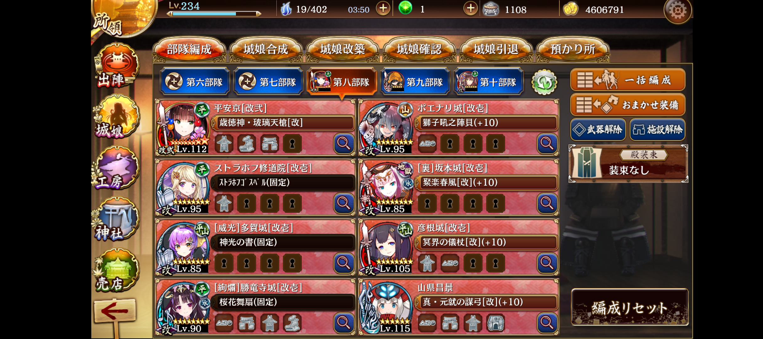 無凸異伝多賀と山県ちゃんを盛って20審やっとできた!絢爛勝竜寺マジありがたい。武器は全部改で…4異伝多賀→7ポエ→17平安改弐(歳徳神+初計27%)→21裏坂本→16彦根即最大化(→18平安計略)→坂本撤退→11ストラホフ→8絢爛勝竜寺→12裏坂本。狐が片付いて6多賀トークンが消えたらストラホフを6へ移動し10山県。裏坂本は最大化、平安は勝竜寺で特技発動のみ、勝竜寺は自計略+気が許すだけ巨大化(たぶん三回)。最後の仏二体に山県計略分の気を取っとければ勝てた。取り回し間違えて山県計略切れたらアウトです。