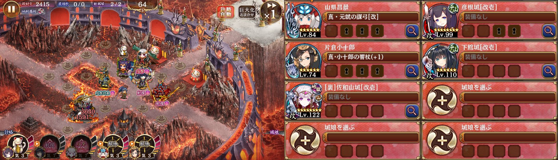 5人編成。最初は彦根と山県(計略自動セット)を配置して順に最大化。次に下館と片倉を配置して片倉を巨大化、裏佐和山も配置して徐々に巨大化。左下から来た溶岩魔人が最初の角を曲がった辺りで全計略自動セット。右から来る溶岩魔人が爆発するまでに裏佐和山の最大化が間に合えば山県が爆発に耐えられるので、後は佐和山計略を継続して終了