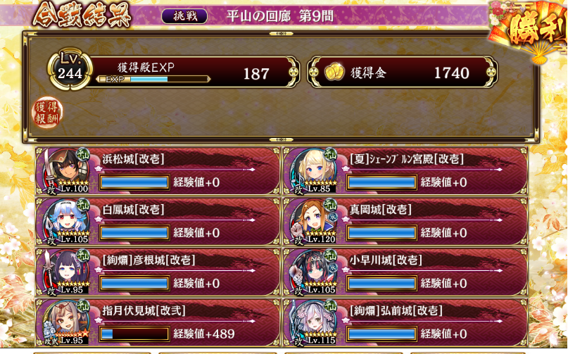 初期気+20加護付きだけど何とかクリア。配置は:3浜松、39小早川、7夏シェーン、11、伏見、1絢爛彦根、40絢爛弘前、38、白鳳、31真岡。 浜松計略を彦根→弘前→白鳳→真岡→シェーン→伏見の順に使用。最大化は彦根→真岡→弘前→白鳳→他。白鳳計略は彦根にずっと。夏シェーントークンは10(消えたら再配置)→30→28