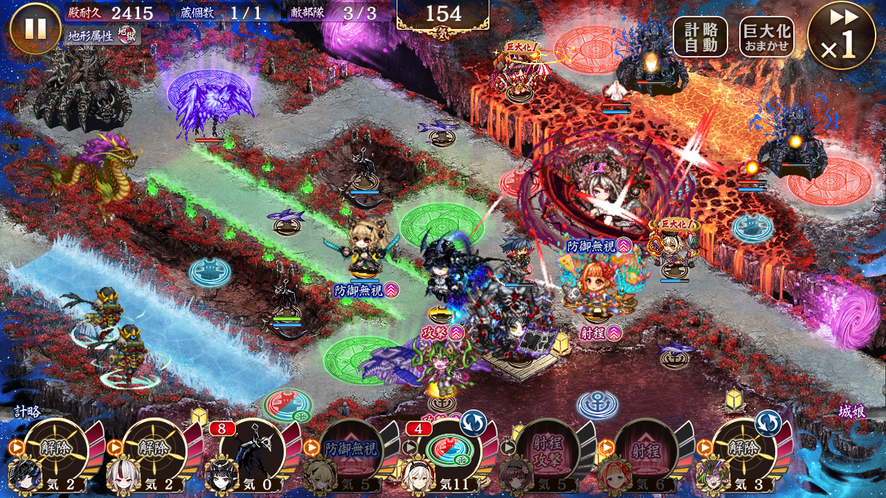 クリアした後にハデスの戦魂へ「被ダメージ減」が効かない事に気づいたので、クリアはできたものの異伝躑躅ヶ崎は向いてませんでした(画像の編成では異伝新府の敵与ダメ減を使って無理矢理突破)。5に歌舞等のヒーラーを置いて毒龍の直撃は伏兵等で回避し、後半の戦魂が現れる前に6に適当な盾(裏真田等)を置けばもっと手を抜いてクリアできると思います。